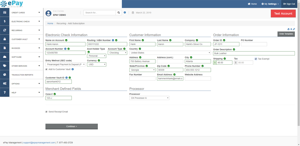Need to setup a short term payment plan for a customer? Do you have customers you bill on a regular basis for long term jobs or service contracts? Recurring billing lets you quickly and easily setup future transactions. Once the payment information has been captured you simply setup the number of payments, the time-frame between each payment and how much you want to charge and your customers credit cards or checking accounts will be billed automatically. The system even notifies you of cards on file that are soon to expire and can make multiple attempts to collect on declined transactions.